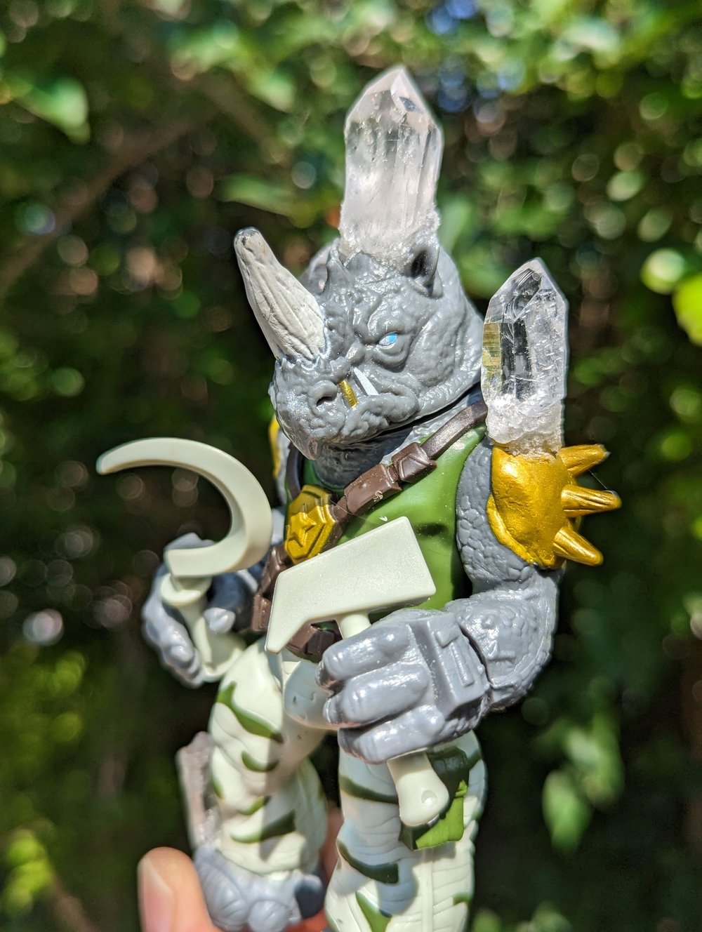 Crystal Rocksteady with a emphasis on ROCK....or crystal. These crystals enhance his powers to fight TMNT, his friendship with his friend Bebop, and his loyalty to Shredder. Crystals can do everything!