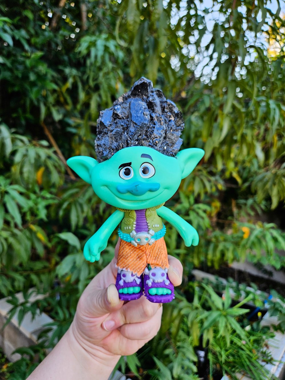 Branch Troll with Smokey Quartz hair is packed full of good vibes and unbelievable cuteness! AND REMEMBER - he likes to hug every 30 minutes! Branch has lil scratches on his nose - no doubt from climbing through all the tree branches to get down to his bunker. Still cute though!